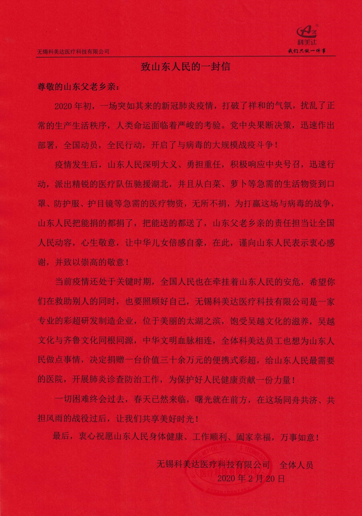 庚子年初,新冠肺炎疫情洶涌而來,隨著鐘南山院士馳援武漢指出新冠肺炎存在“人傳人”的現(xiàn)象,一場史無前例的疫情攻堅戰(zhàn)在全國打響。武漢告急,全國馳援,從生活物資到醫(yī)療用品源源不斷往最需要的地方,山東人民搬家式的支援抗疫模式更是感動了全國人民,彩超作為新冠肺炎病情診斷的重要手段,得到臨床專家的重視,為緩解疫情防控期間醫(yī)療物資緊缺狀況,有效防范醫(yī)護人員感染和疫情擴散風(fēng)險,科美達公司主動聯(lián)系山東省慈善機構(gòu),向濟南市鋼城區(qū)慈善總會定向捐贈了價值38萬元的便攜式彩超設(shè)備,用于濟南市鋼城區(qū)醫(yī)院抗擊肺炎疫情和人民健康檢查,確保戰(zhàn)略后方穩(wěn)固。